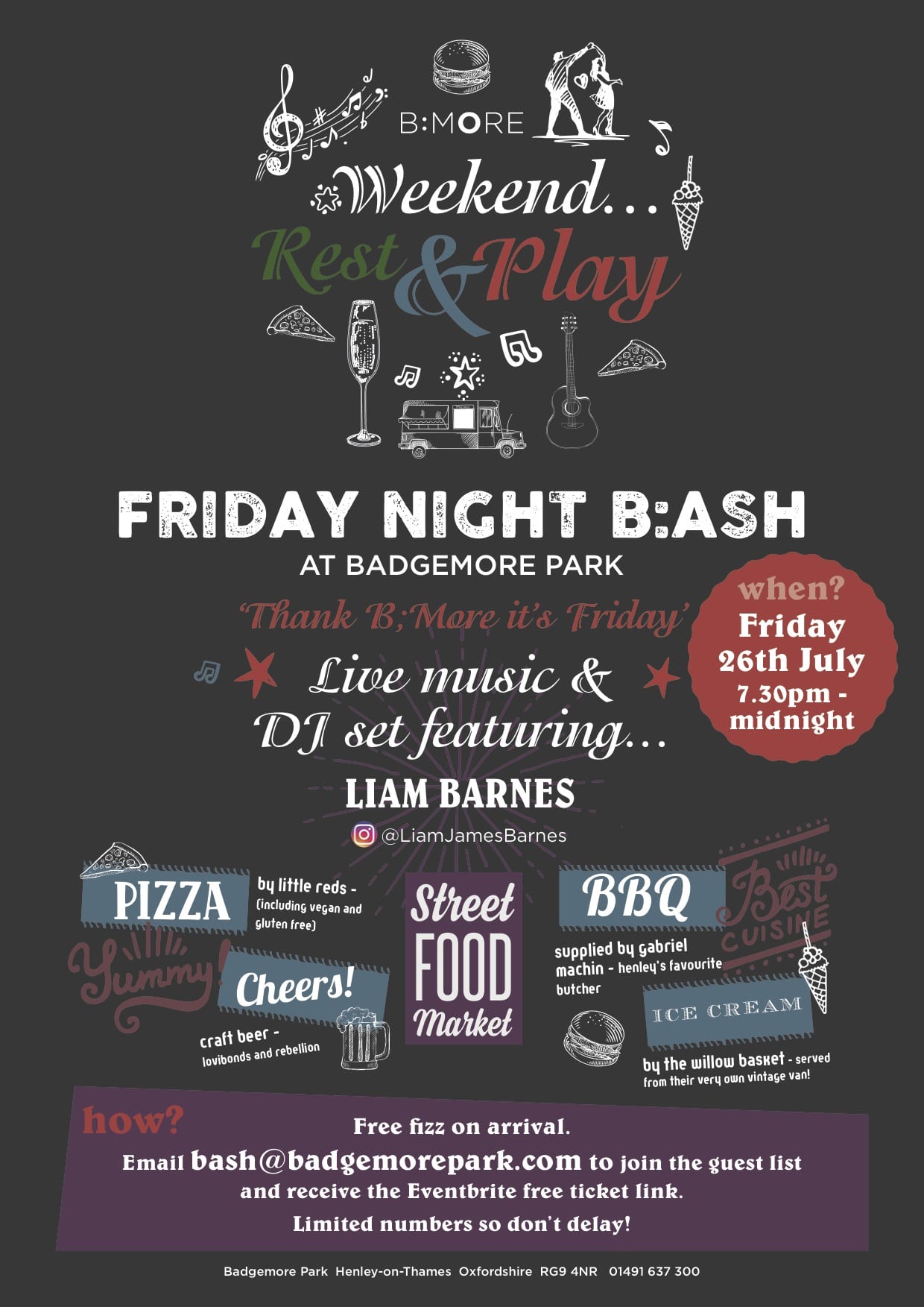 We’d love you to join us on Friday 26th July 2019 for our FRIDAY NIGHT B:ASH at Badgemore Park in Henley-on-Thames. Here’s what’s on offer: