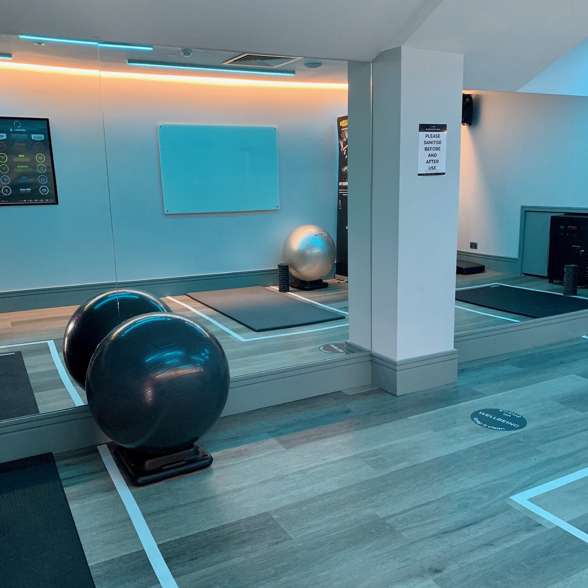 - Spacious free weights area with dumbbells up to 32kg, Olympic squat rack, and fitted barbells alongside a selection of kettlebells, medicine balls and other pieces of equipment to make sure all aspects of your workout are covered.